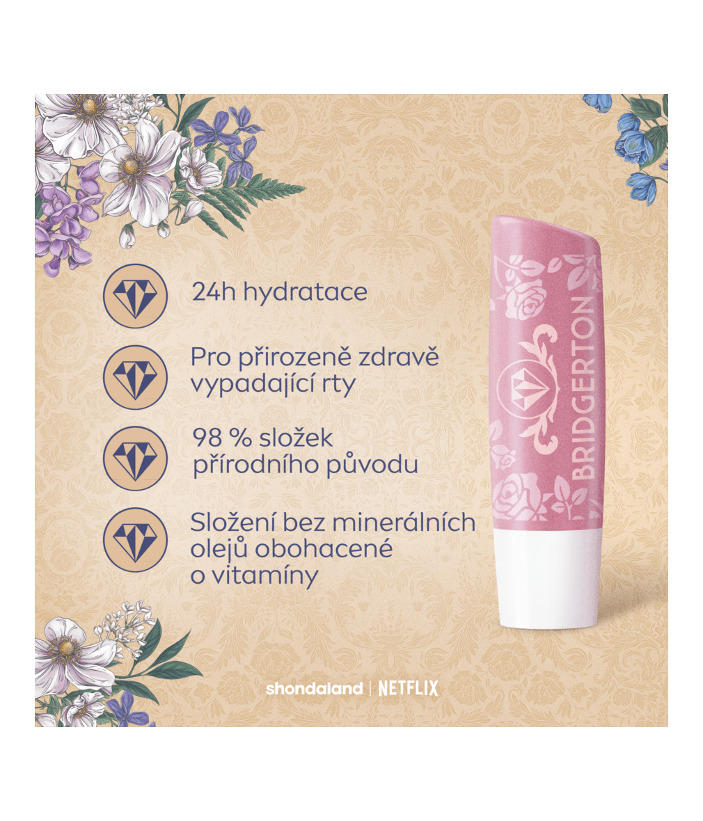 Limitovaná edice. Inspirováno příběhem lásky Daphne & Simona, která začala jako dohoda, ale rozkvetla v pravý cit a nejčistší oddanost. Tónovací balzám s dotykem romantické elegance propůjčí rtům jemnou vůni růží a zanechá je hebké a jemné. "