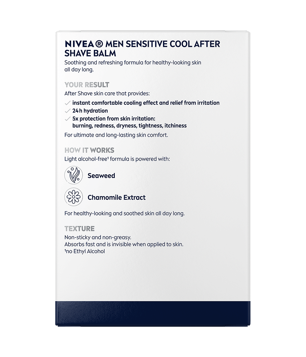 Trápí vás podrážděná tvář po každém holení? Pak je třeba dopřát jí výjimečnou péči. Vsaďte na šetrné složení s pečujícím heřmánkem a bez alkoholu*. Výsledkem bude ošetřená a zklidněná pleť. Vychutnejte si také příjemně chladivé osvěžení díky výtažkům z mořských řas. Zklidňující složení okamžitě ulevuje od 5 příznaků podráždění pleti: pálení, zarudnutí, suchá pleť, napjatost a svědění. Okamžitá úleva pro vaši pleť po každém holení: NIVEA MEN Balzám po holení Sensitive.