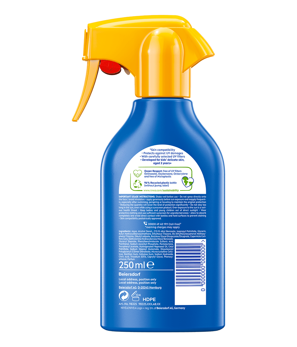 Před použitím řádně protřepejte! Nastříkejte – přímo na dítě. Vyhněte se inhalaci obsahu. Aplikujte v dostatečném množství před sluněním a k udržení ochrany pravidelně opakujte, zejména v případě pocení, po koupání a po osušení ručníkem. Menší množství významně snižuje stupeň ochrany. Nezůstávejte na slunci příliš dlouho, i když jste použili prostředky na ochranu proti slunečnímu záření; nadměrná sluneční expozice představuje vážné zdravotní riziko. Ani výrobky proti slunečnímu záření neposkytují 100% ochranu. Kojence a malé děti nevystavujte přímému slunečnímu záření. Chraňte dítě před slunečním zářením oblečením a používejte dostatečné množství sluneční ochrany na nezakrytá místa. Nechte důkladně vstřebat a vyhněte se přímému kontaktu s oblečením a tvrdými povrchy, může zanechat stopy.