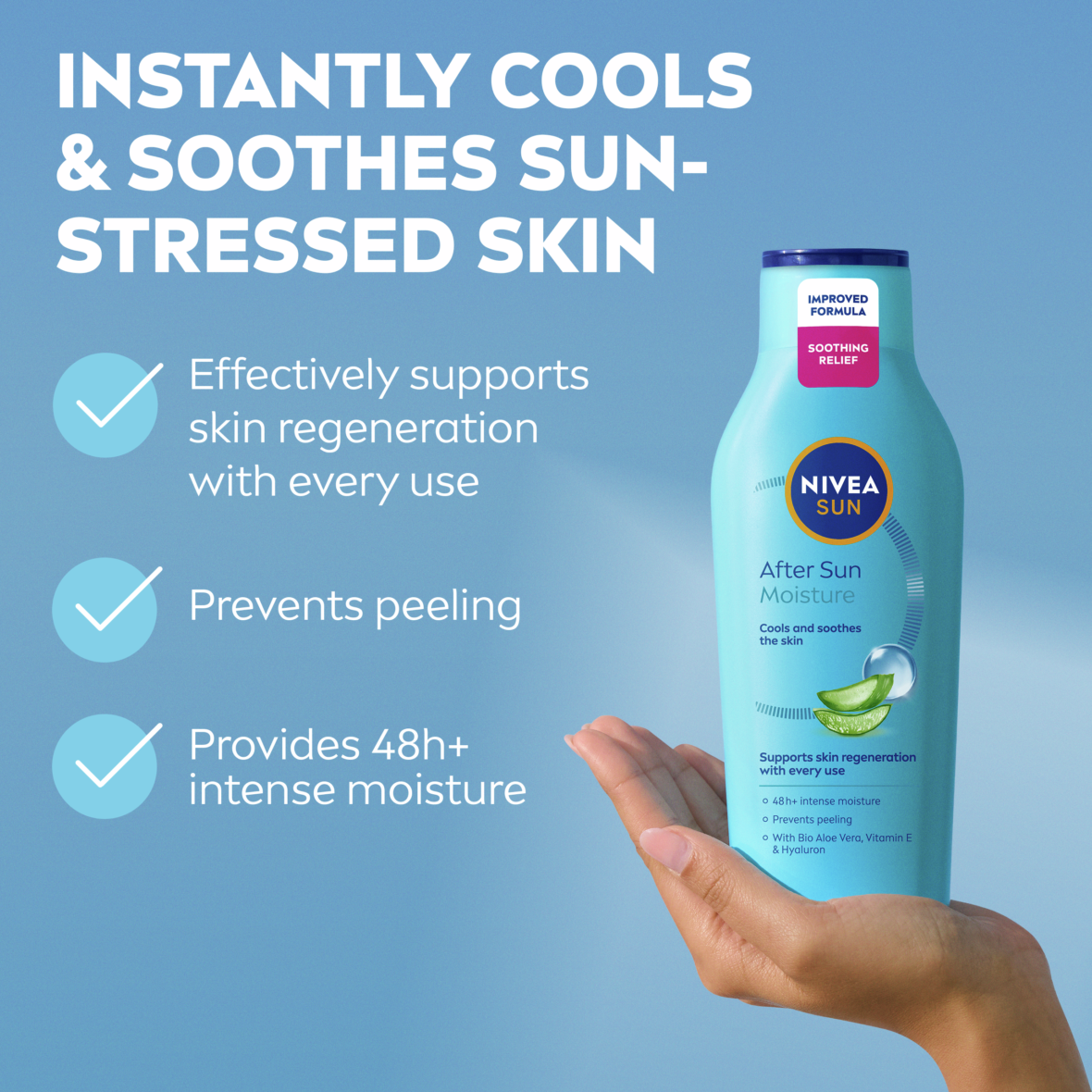 Zklidněte svou opálenou pokožku a podpořte její regeneraci díky chladivému mléku. Hydratační složení s bio aloe vera, vitamínem E a kyselinou hyaluronovou poskytuje intenzivní hydrataci až na 48 hodin. Pro zdravý pocit pokožky po opalování.