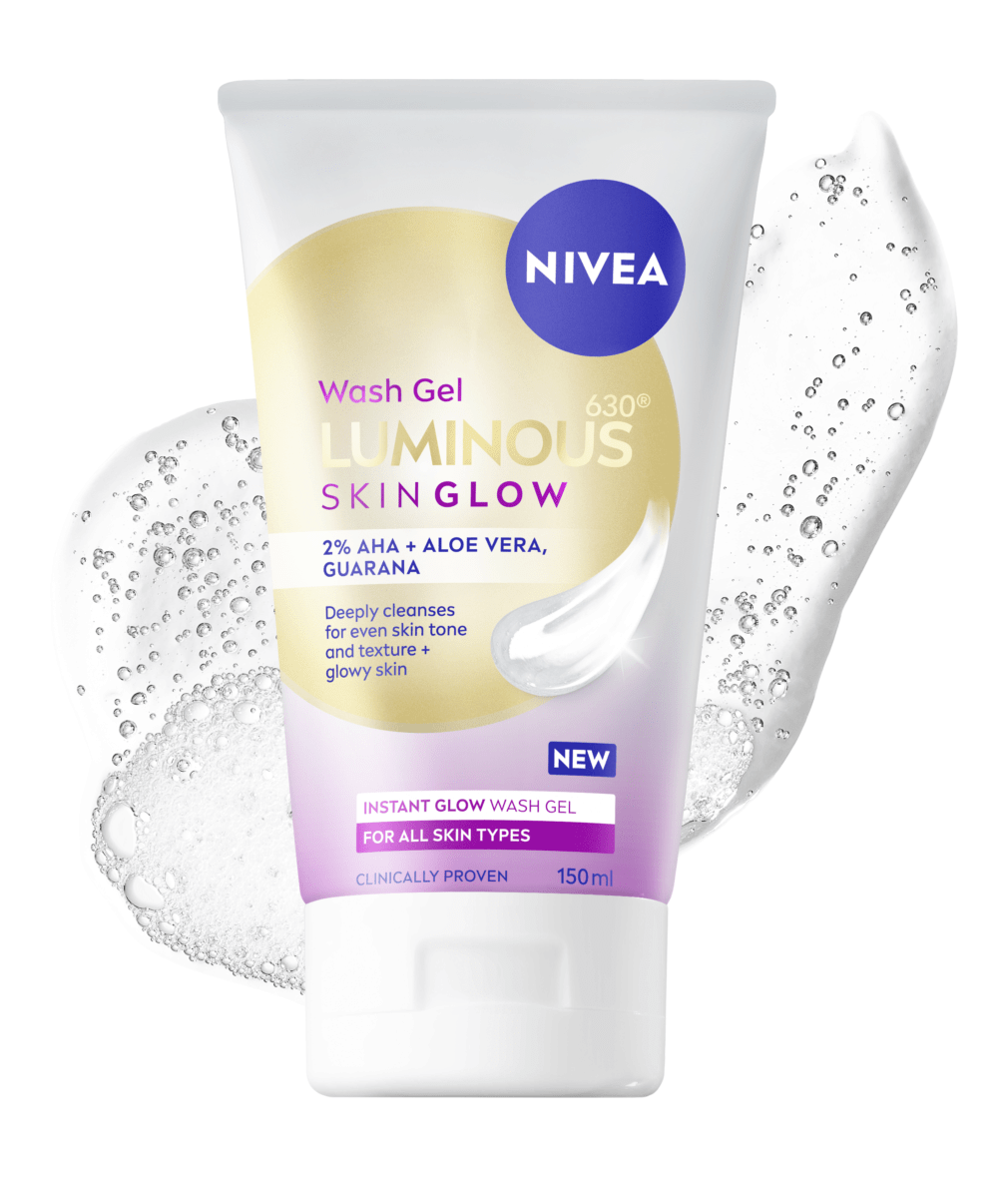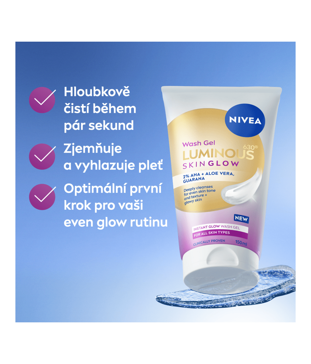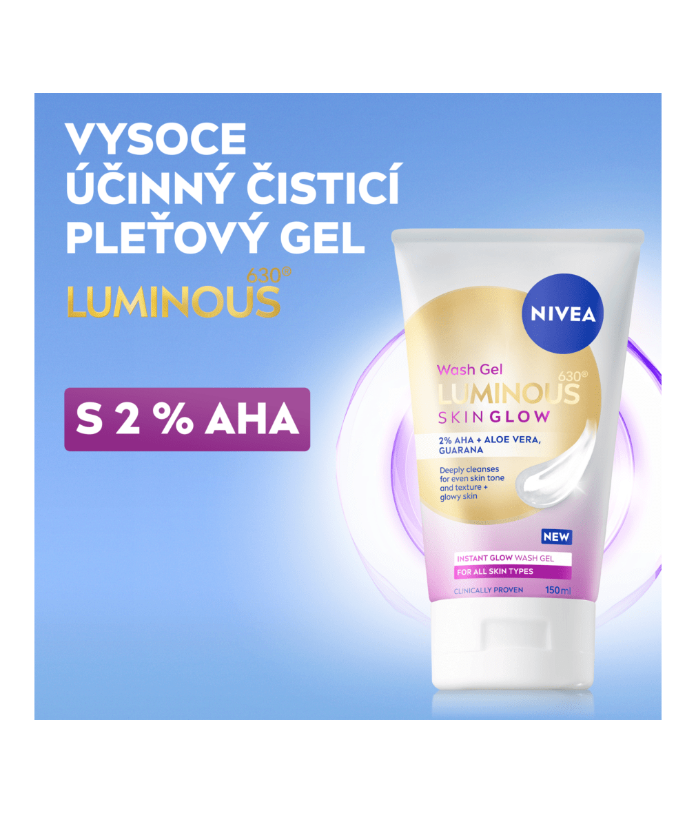 Čisticí pleťový gel Luminous630 Skin Glow s 2 % AHA, aloe vera a guaranou pleť hloubkově čistí a pokryje tři dimenze GLOW: odstraňuje nežádoucí lesk, zjemňuje a vyhlazuje pleť a podporuje její vzhled. Výsledkem je sjednocená a zářivá pleť už za 1 týden.
