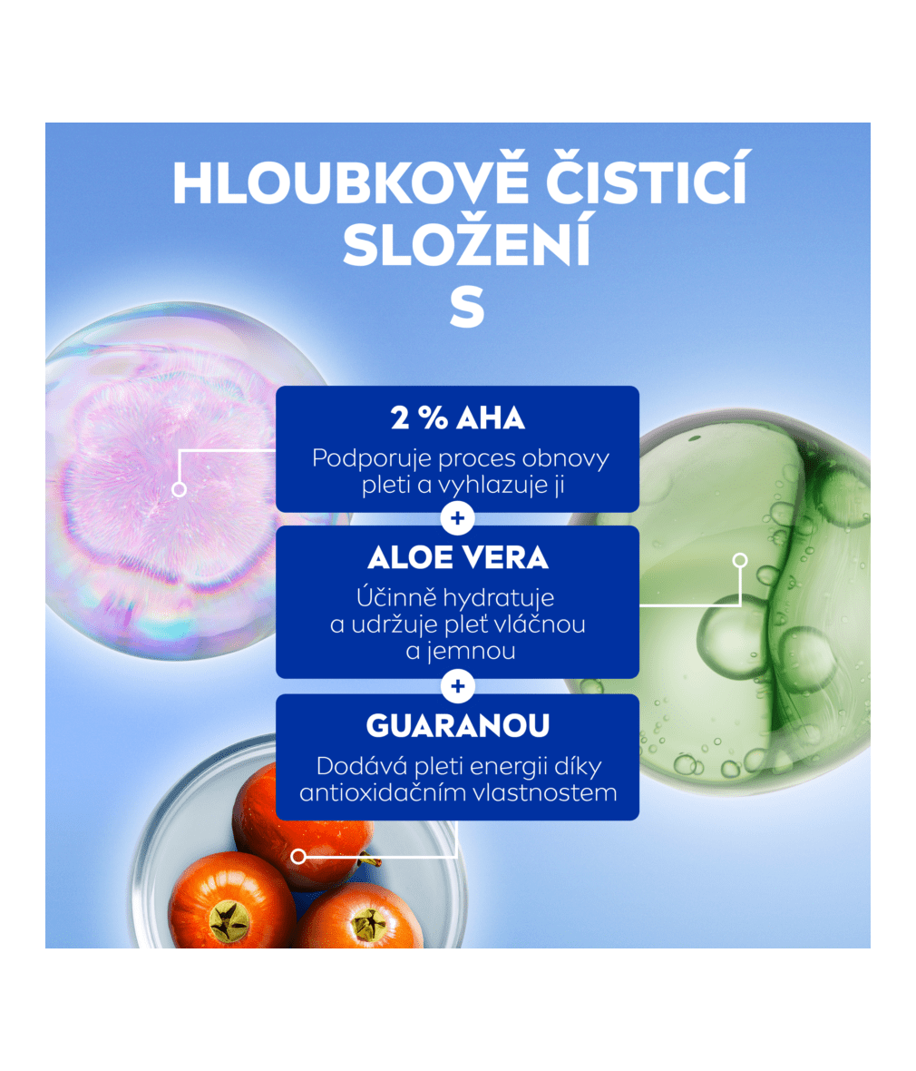 Gel obsahuje technologii povrchově aktivních látek pro hloubkové a jemné čištění pleti. Složení s účinnou peelingovou látkou (AHA) pleť jemně, ale důkladně exfoliuje, podporuje její obnovu a zanechává ji vyhlazenou a rozjasněnou. Aloe vera ji zase okamžitě hydratuje a udržuje vláčnou. Guarana pak pleť revitalizuje a oživuje.