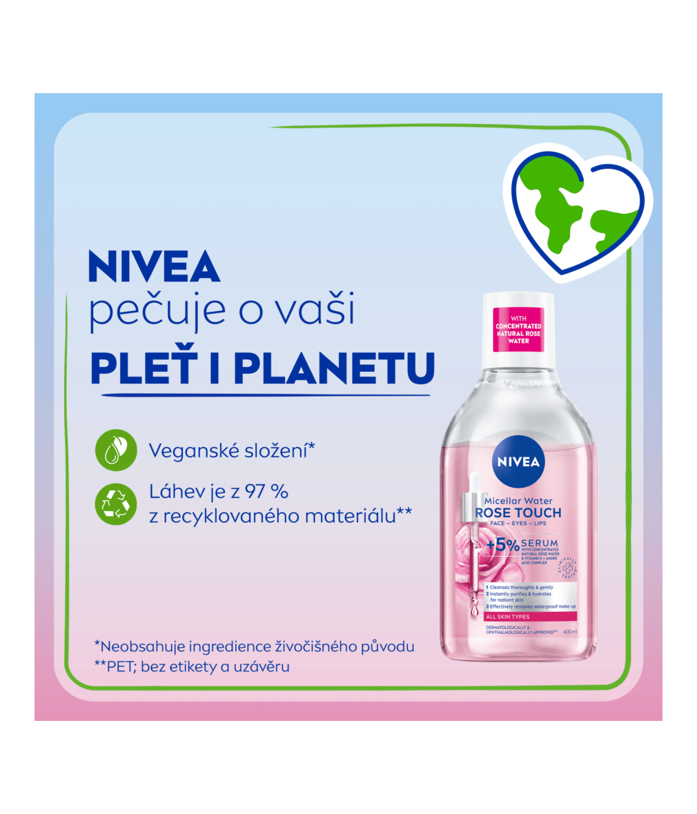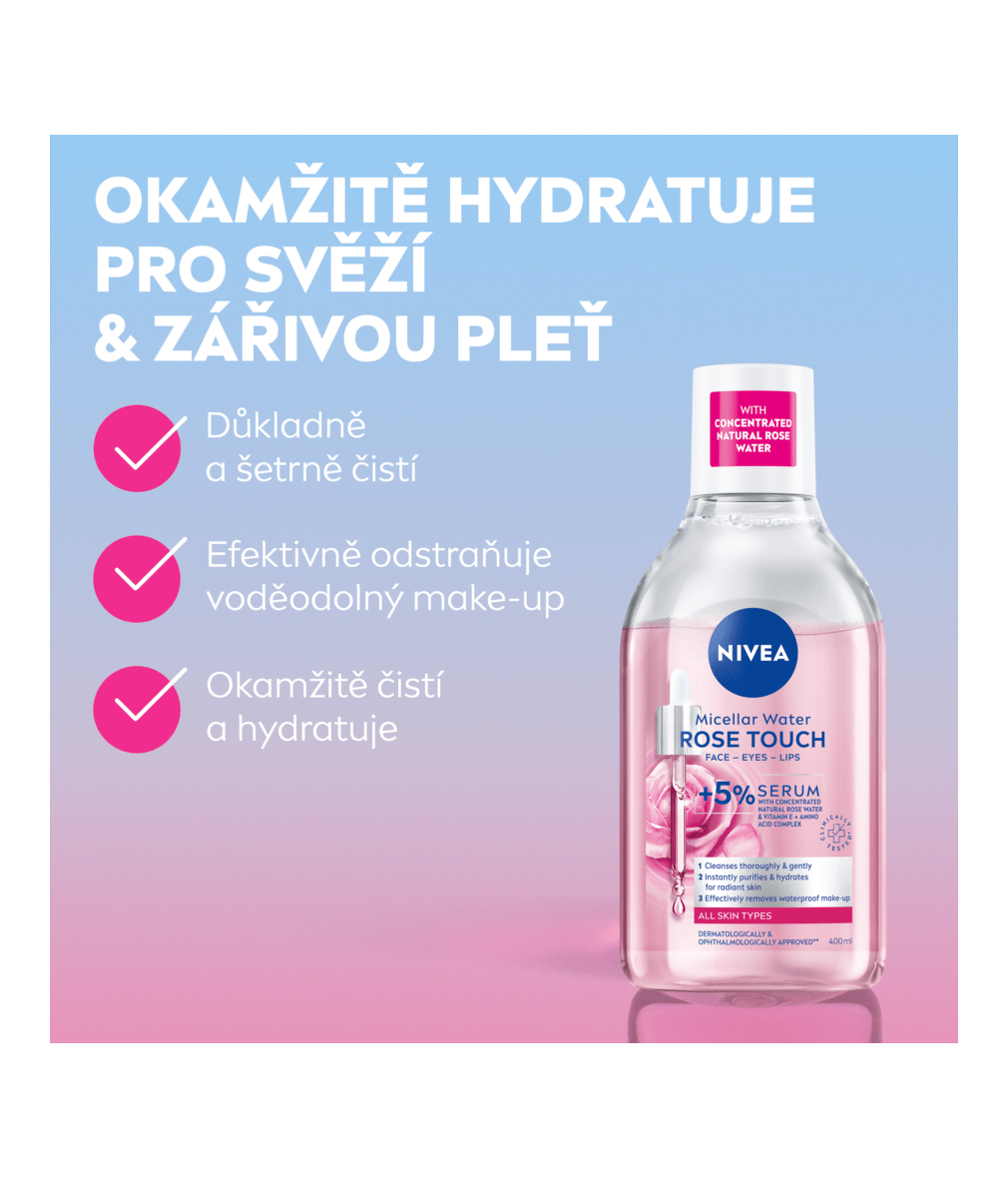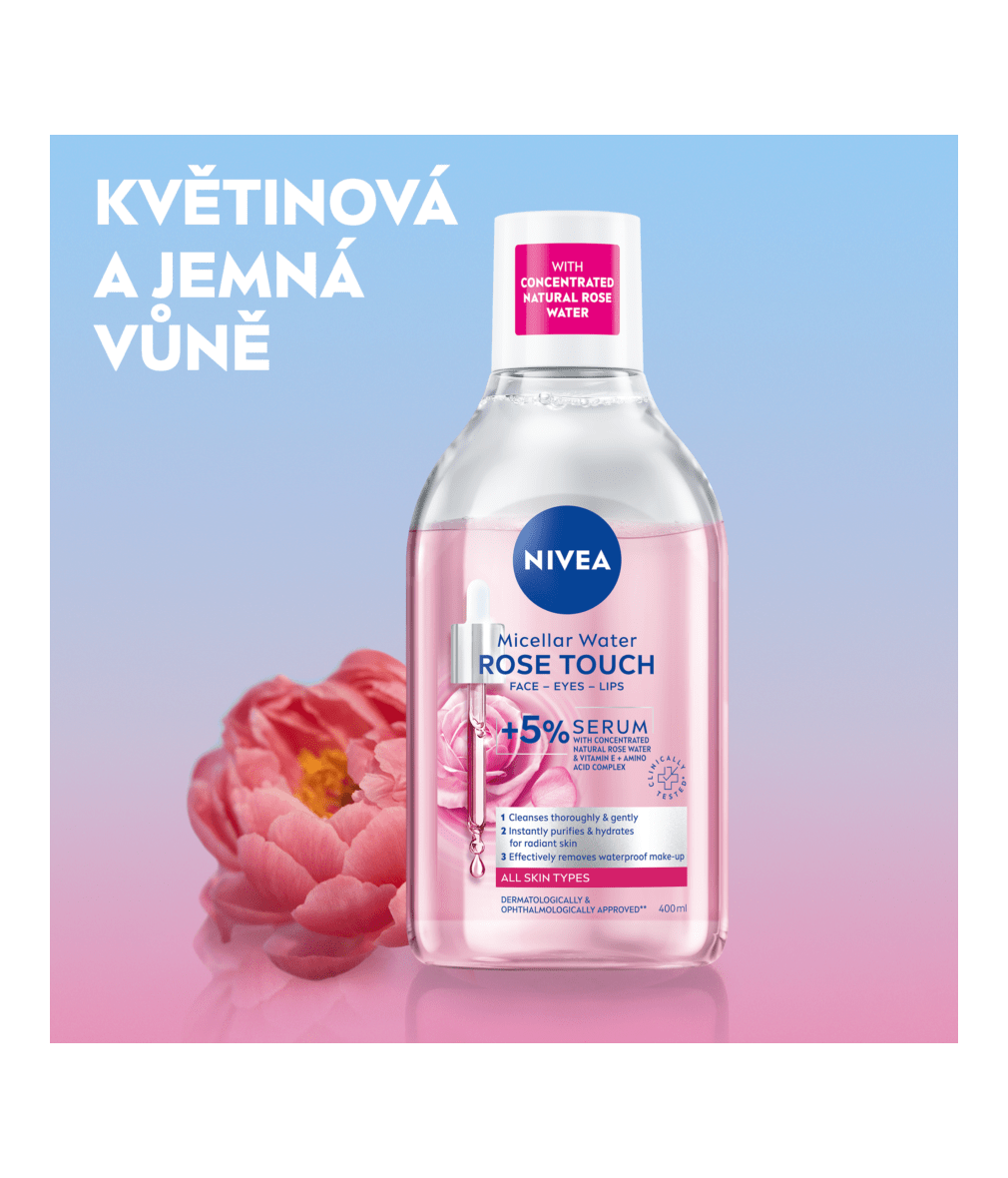 Odstraní běžný i voděodolný make-up, všechny nečistoty i SPF. Hydratuje, rozjasní a osvěží pleť. S obsahem 5 % séra s koncentrovanou přírodní růžovou vodou a vitamínem E a s komplexem aminokyselin. Poraďte si s odličováním bez nepříjemného tření: NIVEA Micelární voda Rose Touch.