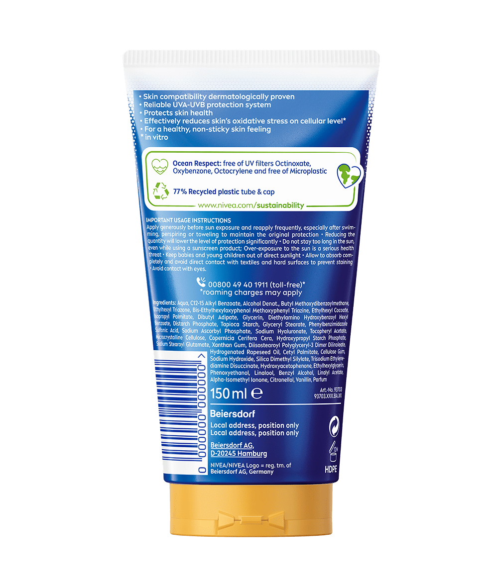 Aplikujte v dostatečném množství před sluněním a k udržení ochrany pravidelně opakujte, zejména v případě pocení, po koupání a po osušení ručníkem. Menší množství významně snižuje stupeň ochrany. Nezůstávejte na slunci příliš dlouho, i když jste použili prostředky na ochranu proti slunečnímu záření; nadměrná sluneční expozice představuje vážné zdravotní riziko. Ani výrobky proti slunečnímu záření neposkytují 100% ochranu. Kojence a malé děti nevystavujte přímému slunečnímu záření. Nechte důkladně vstřebat a vyhněte se přímému kontaktu s oblečením a tvrdými povrchy, může zanechat stopy.