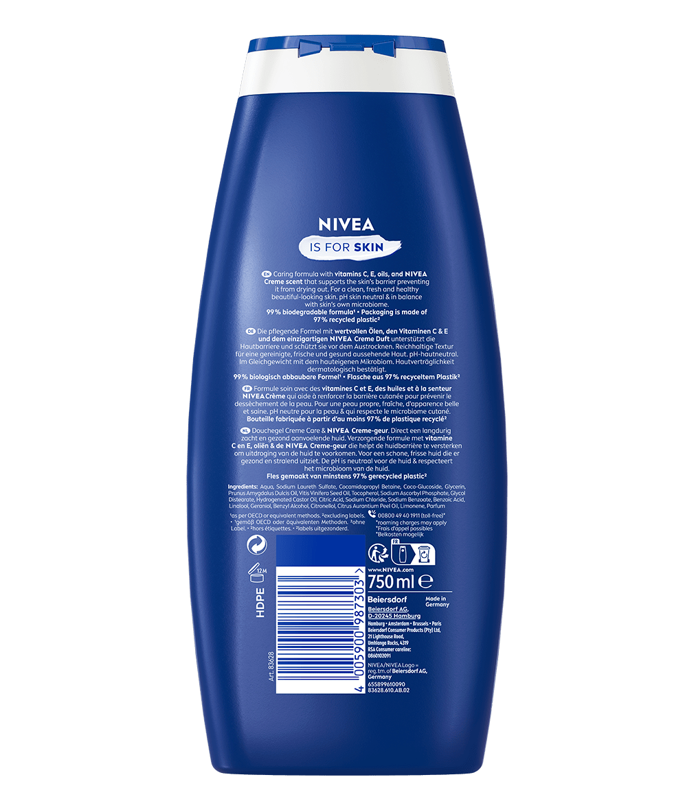 Proměňte každodenní sprchu v jedinečný zážitek. Originální vůně krému NIVEA uvolní vaši mysl a pečující složení s vitamíny C a E a vzácnými oleji bude hýčkat vaši pokožku, aniž by narušilo její přirozenou mikrobiální vrstvu. Zároveň chrání nejen vás, ale i životní prostředí. Lahev je totiž z 98 % z recyklovaného plastu. Pocit dokonale čisté a vyživené pokožky vám navíc vydrží i po osušení ručníkem. Svěřte svoje tělo do péče kvalitní sprchové kosmetiky. Vsaďte na: NIVEA Pečující sprchový gel Creme Care.