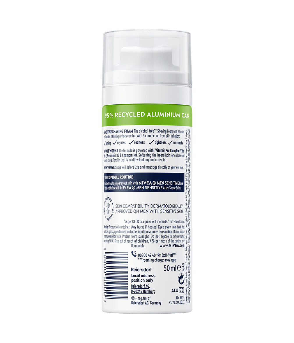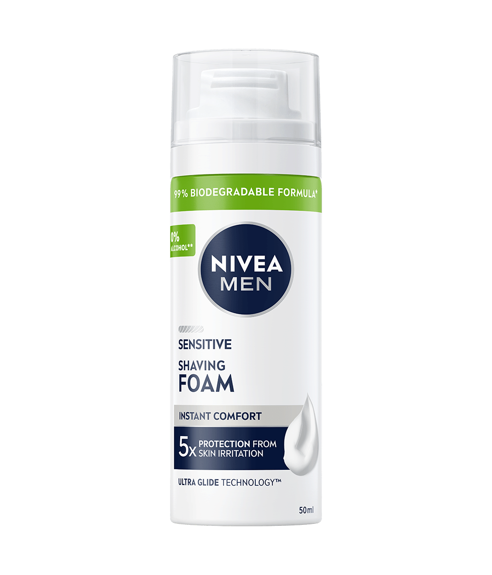 Holení bez poranění? Pro citlivou pleť zvolte účinné složení s Ultra Glide technologií, heřmánkem a vitamínem E. Pro zklidněnou, regenerovanou a hydratovanou pleť bez podráždění i na cestách: NIVEA MEN Pěna na holení Sensitive mini.
