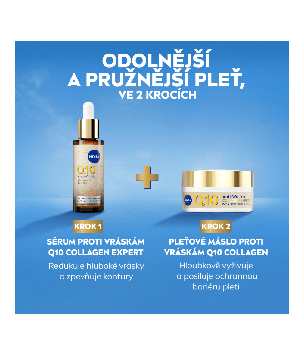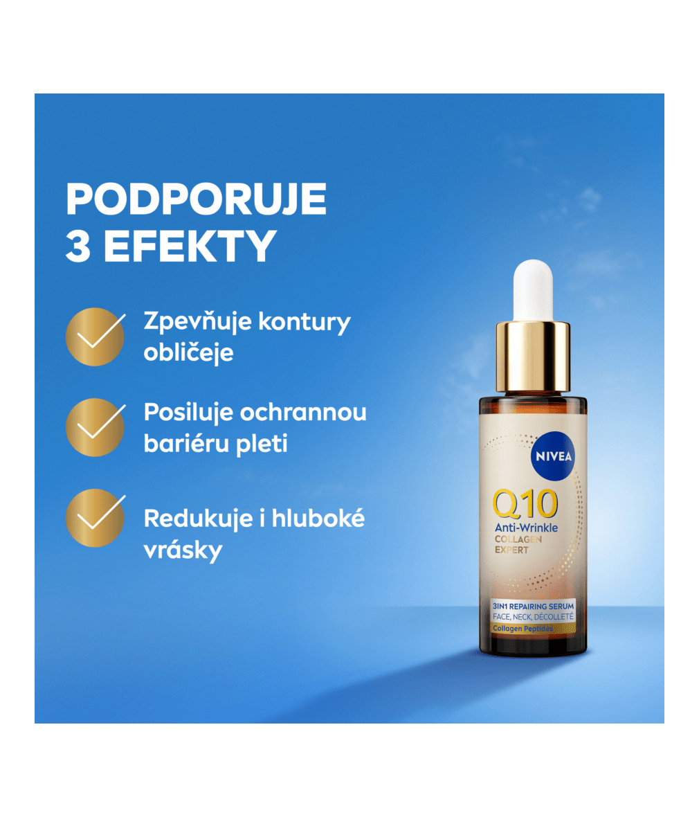 Odolnější, pružnější, přirozeně sebejistá! Sérum proti vráskám Q10 Collagen Expert s čistým koenzymem Q10, kolagenovými peptidy a ceramidem podporuje 3 efekty: zpevňuje kontury obličeje, posiluje bariéru pleti a redukuje hluboké vrásky. Ideální pro suchou i zralou pleť.
