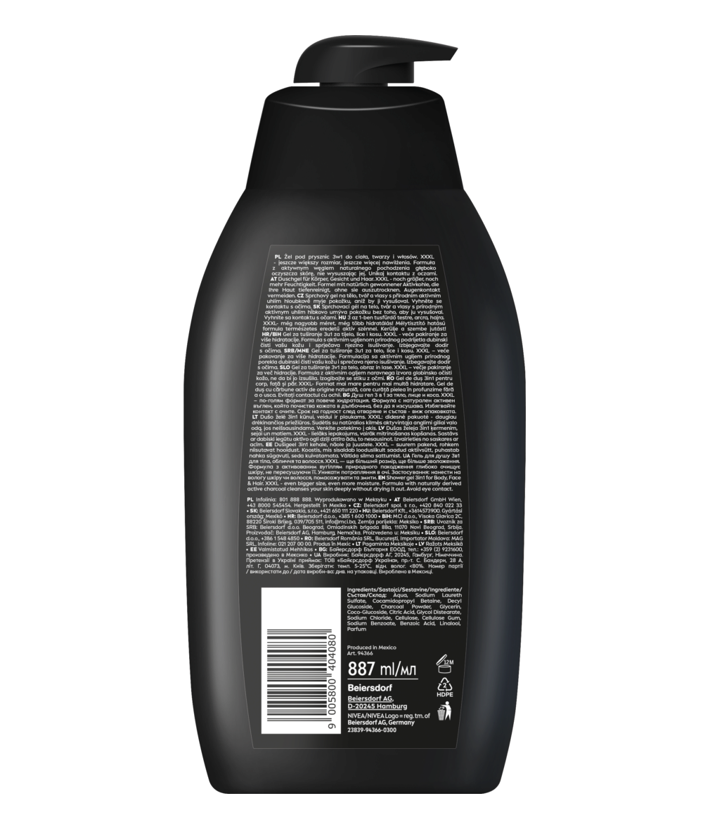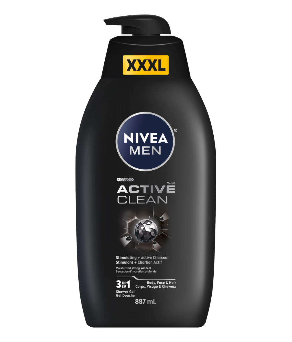 Sprchový gel na tělo, tvář a vlasy šetří čas při mytí. Pečuje o pokožku a díky přírodním aktivním složkám uhlí ji zbavuje všech nečistot. Nyní v ještě větším balení. Zkuste: NIVEA MEN Sprchový gel pro muže 3 v 1 Active Clean XXXL.