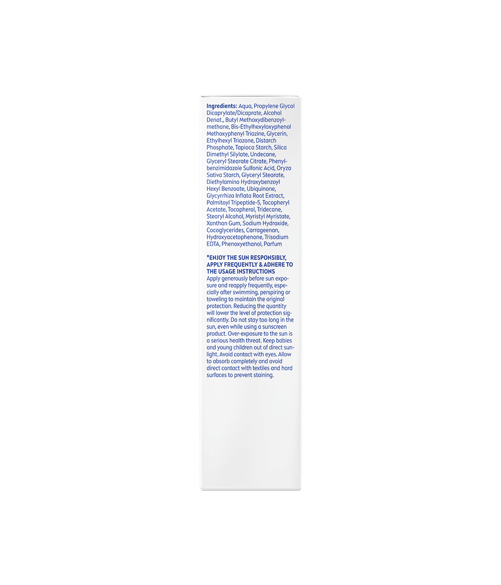 Obsahuje: Aqua, Alcohol Denat, Butyl Methoxydibenzoylmethane, Bis-Ethylhexyloxyphenol Methoxyphenyl Triazine, Glycerin, Ethylhexyl Triazone, Distarch Phosphate, Tapioca Starch, Silica Dimethyl Silylate, Glyceryl Stearate Citrate, Phenylbenzimidazole Sulfonic Acid, Oryza Sativa Starch, Glyceryl Stearate, Diethylamino Hydroxybenzoyl Hexyl Benzoate, Ubiquinone, Glycyrrhiza Inflata Root Extract, Tocopheryl Acetate, Tocopherol, Stearyl Alcohol, Myristyl Myristate, Xanthan Gum, Sodium Hydroxide, Cocoglycerides, Carrageenan, Hydroxyacetophenone, Trisodium EDTA, Phenoxyethanol, Parfum