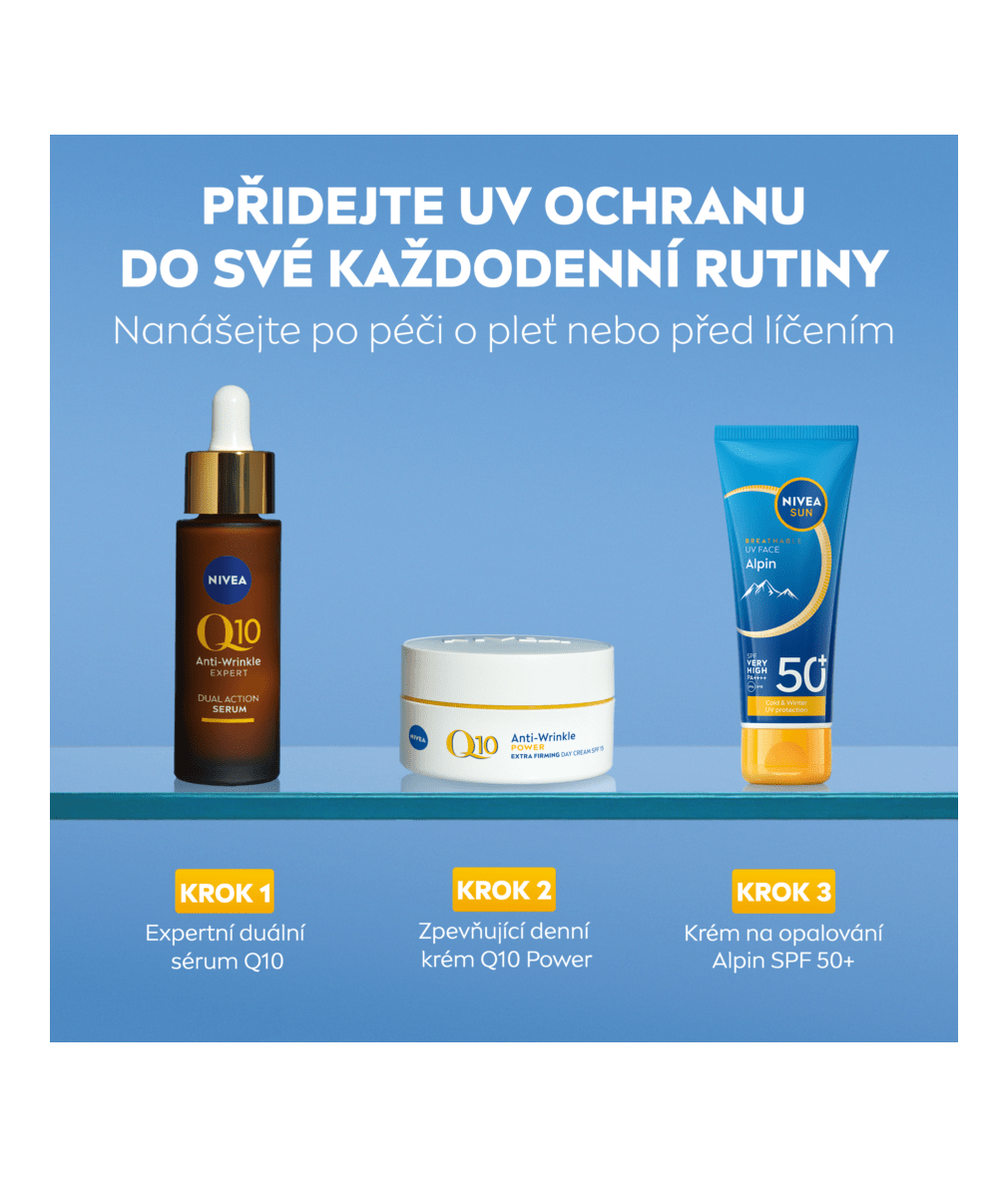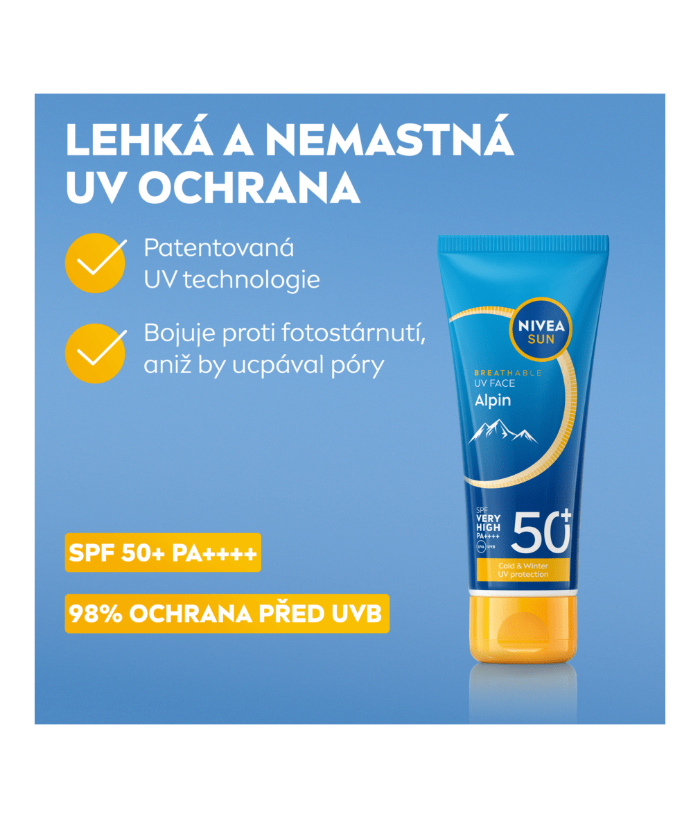 NIVEA Sun Pleťový krém na opalování ALPIN SPF 50+ s velmi vysokou ochranou jsme speciálně vyvinuli pro horské podmínky. Lehké nemastné složení chrání pleť před UVA/UVB zářením, modrým světlem, volnými radikály a UV zářením od sněhu. Poskytuje 24h hydrataci a bojuje proti fotostárnutí.