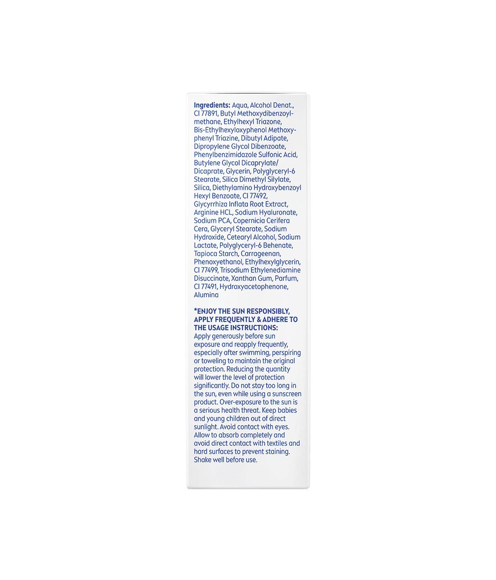 Obsahuje: Aqua, Alcohol Denat, CI 77891, Butyl Methoxydibenzoylmethane, Ethylhexyl Triazone, Bis-Ethylhexyloxyphenol Methoxyphenyl Triazine, Dibutyl Adipate, Dipropylene Glycol Dibenzoate, Phenylbenzimidazole Sulfonic Acid, Butylene Glycol Dicaprylate/Dicaprate, Glycerin, Polyglyceryl-6 Stearate, Silica Dimethyl Silylate, Silica, Diethylamino Hydroxybenzoyl Hexyl Benzoate, CI 77492, Glycyrrhiza Inflata Root Extract, Arginine HCL, Sodium Hyaluronate, Sodium PCA, Copernicia Cerifera Cera, Glyceryl Stearate, Sodium Hydroxide, Cetearyl Alcohol, Sodium Lactate, Polyglyceryl-6 Behenate, Tapioca Starch, Carrageenan, Phenoxyethanol, Ethylhexylglycerin, CI 77499, Trisodium Ethylenediamine Disuccinate, Xanthan Gum, Parfum, CI 77491, Hydroxyacetophenone, Alumina